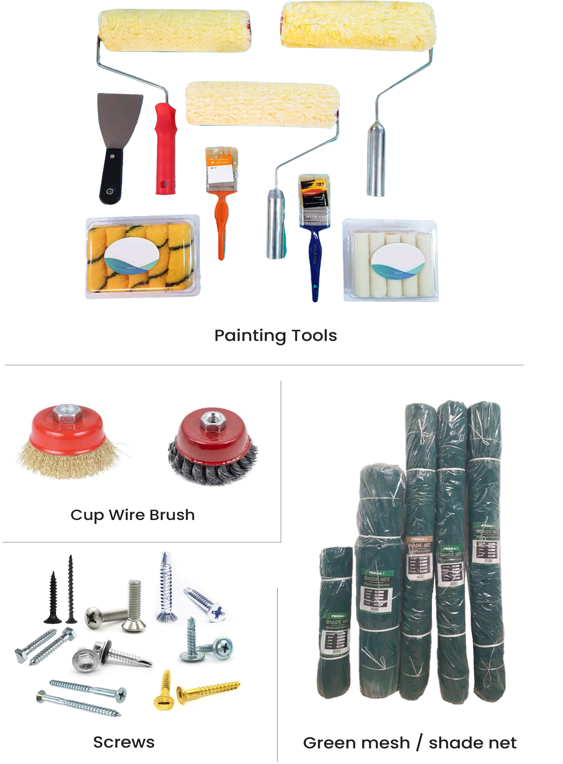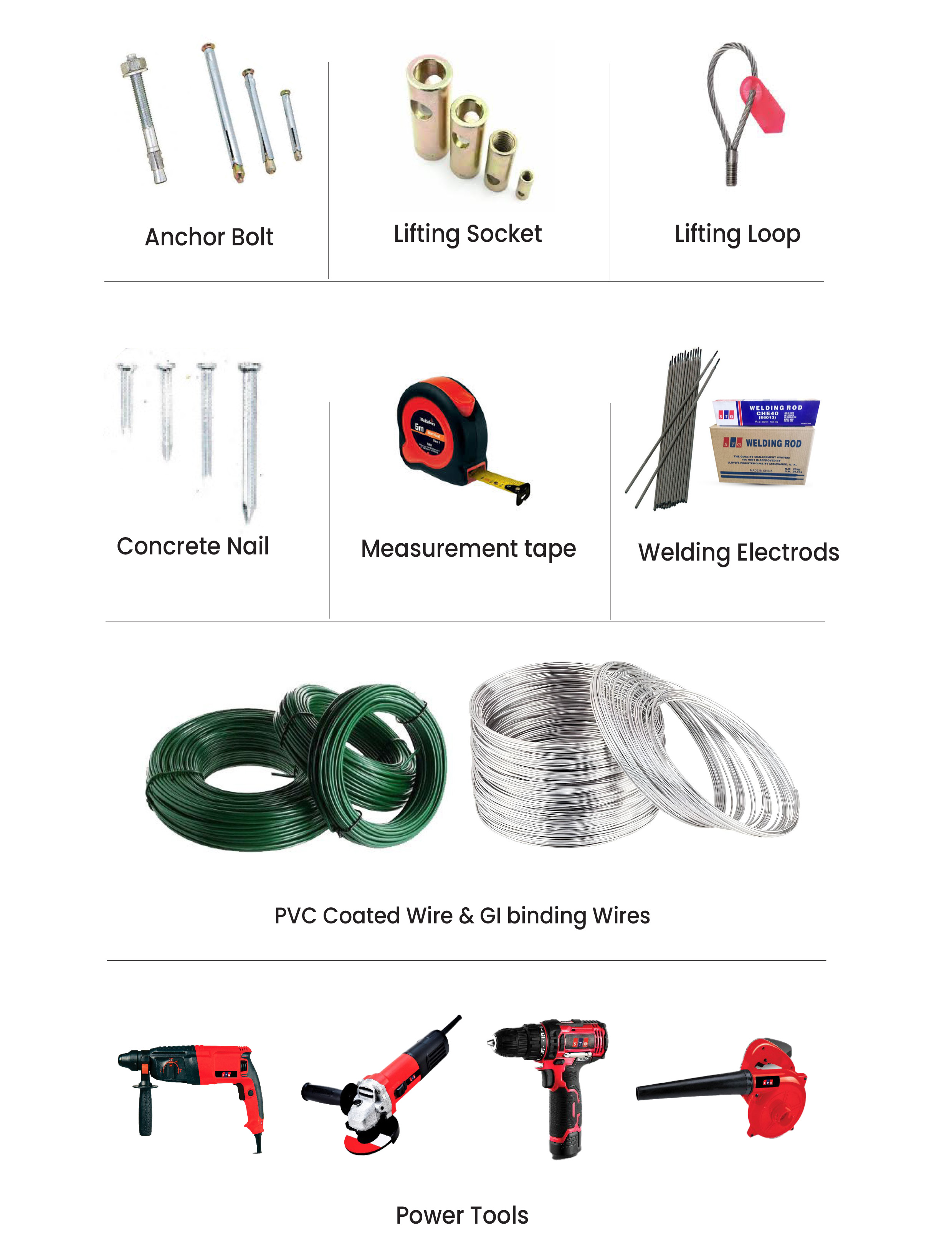 High-strength nails, screws, bolts, anchor fasteners, welding rods, and all essential hardware materials for construction and maintenance.