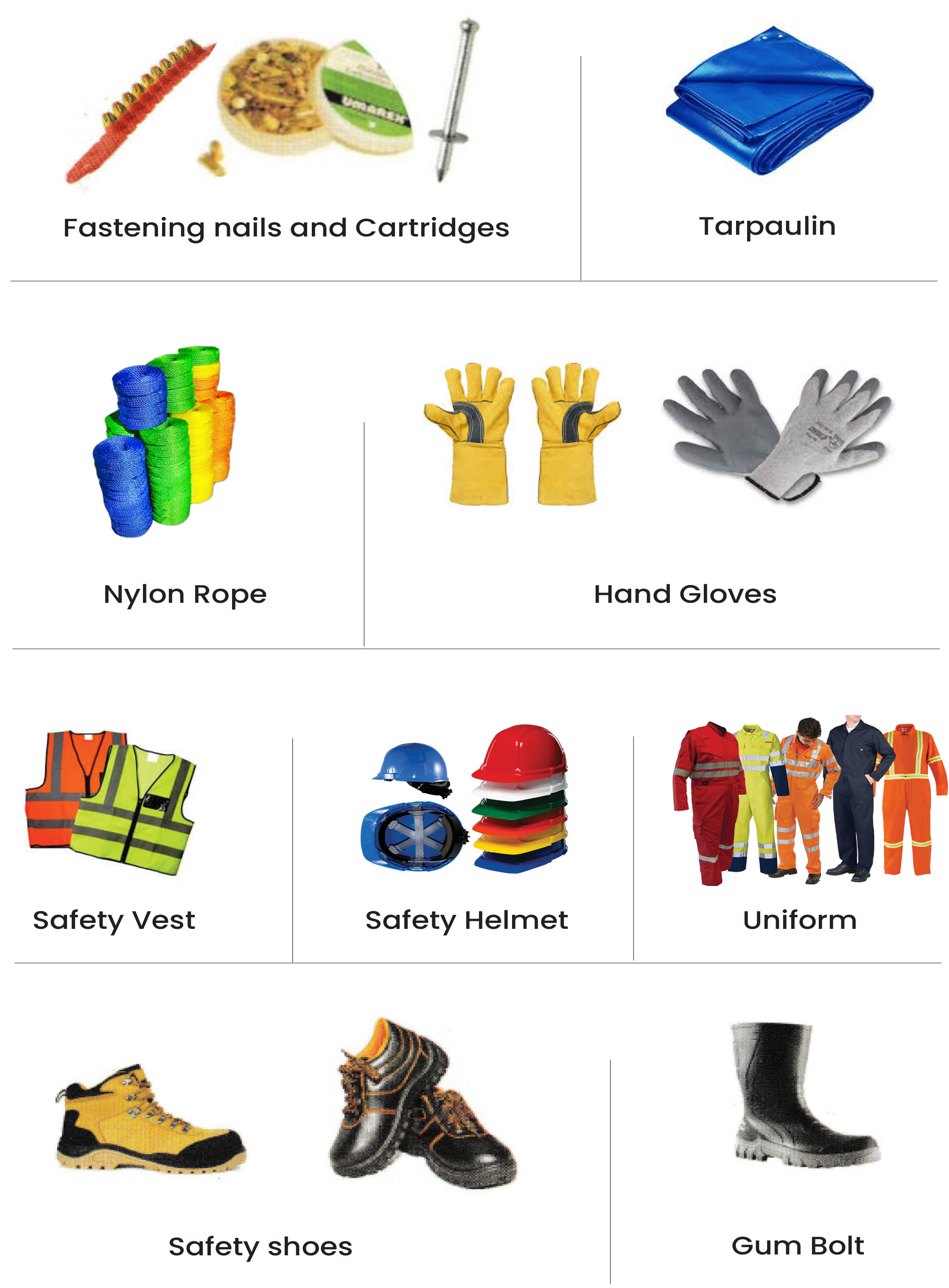 Safety helmets, gloves, shoes, goggles, reflective vests, uniforms, and workplace protection accessories for industrial safety compliance.